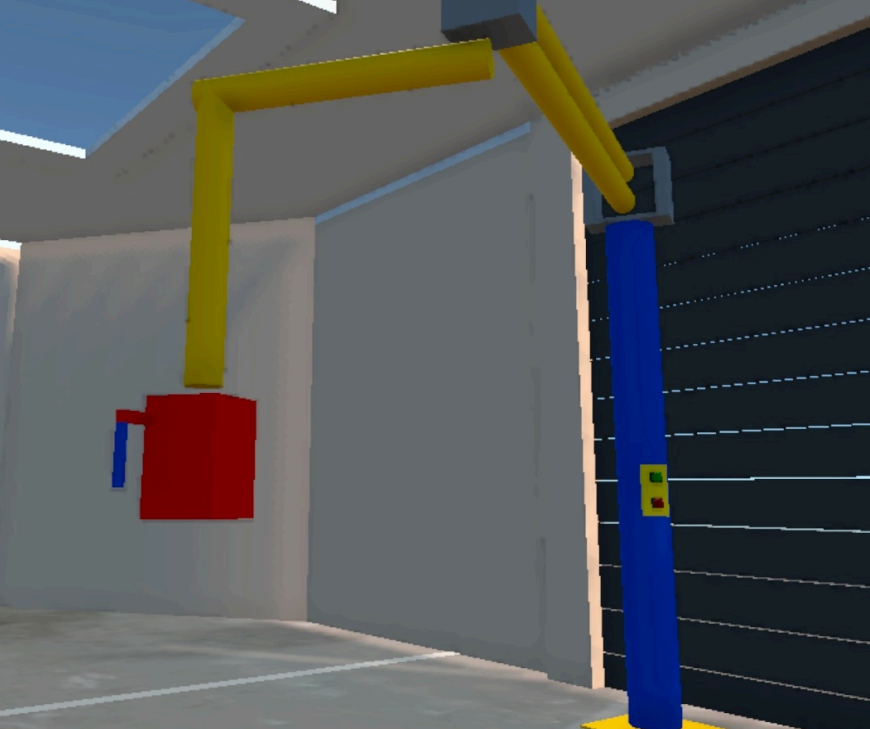 L’utilisateur agit au moyen de deux poignées VR saisissables, associées aux mains gauche et droite. Cette contrainte bimanuel est pertinente pédagogiquement, car elle simule une coordination motrice proche d’une tâche réelle de conduite d’engin.