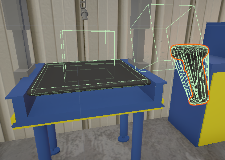 Le coeur du module est centralise dans un gestionnaire dedie (TireManager.cs). Le lancement de l’epreuve est realise par un bouton vert interactif VR. Lorsqu’une main entre dans la zone d’interaction, un evenement de type spawn est declenche et demarre la generation progressive des pneus.